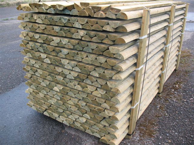 Rohe Pfähle werden aus waldfrischem Holz gefräst. Und anschließend für einen kurzen Zeitraum luftgetrocknet sowie verpackt.